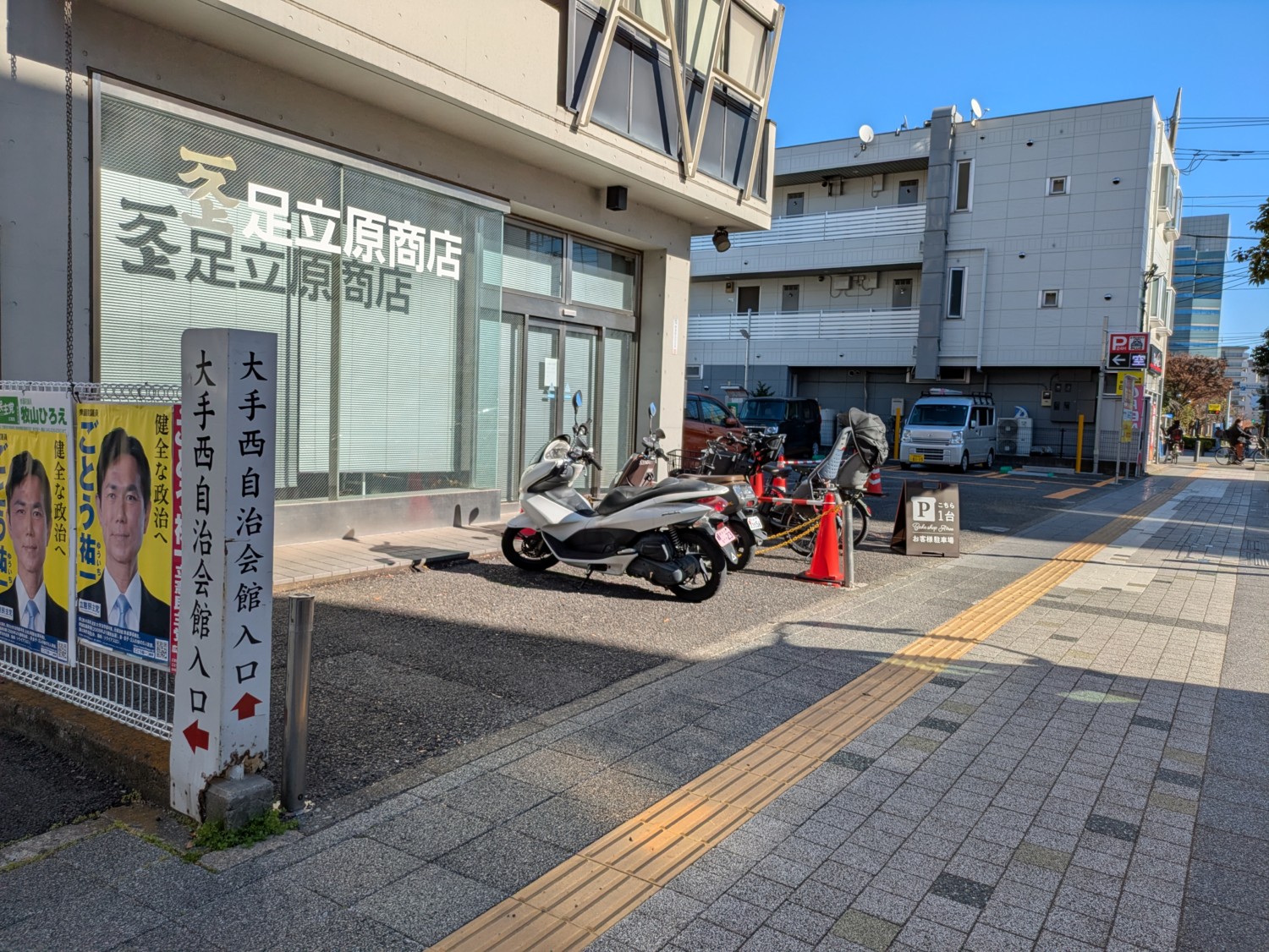 店舗前に駐輪場と駐車場1台分、お隣の足立商店様前にも駐車場1台分があります。
